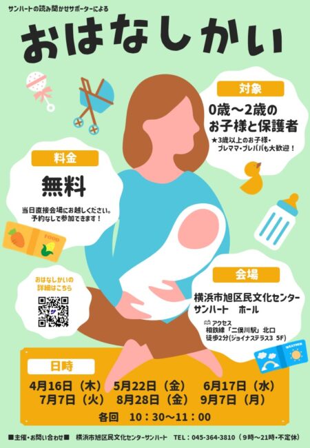 サンハート読み聞かせサポーターによるえほんの読み聞かせや手遊びなど、親子で一緒にお楽しみいただける企画です。 【対象】 【その他】 【サンハート読み聞かせサポーター】 |